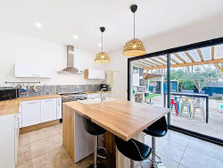 Dès l'entrée, un hall comprenant un espace de rangement dessert une magnifique pièce de vie d'environ 73 m². Celle-ci se compose d'un salon-séjour baigné de lumière (exposition Sud-Est), agrémenté d'une cave à vin en sous-sol et d'un poêle à bois, ainsi que d'une cuisine ouverte, aménagée et équipée, prolongée par une pratique arrière-cuisine.