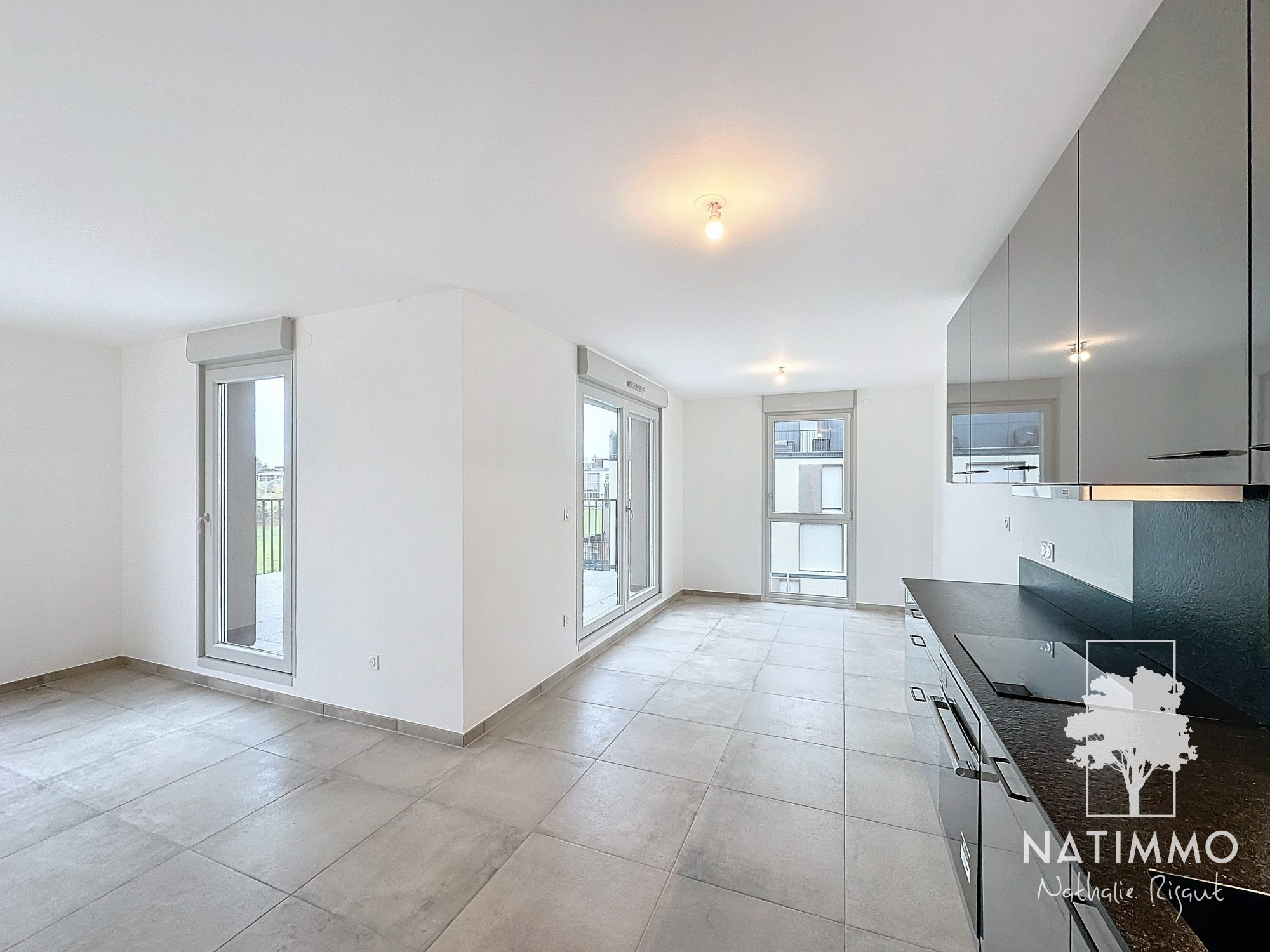Une grande pièce de vie ouverte sur une cuisine équipée