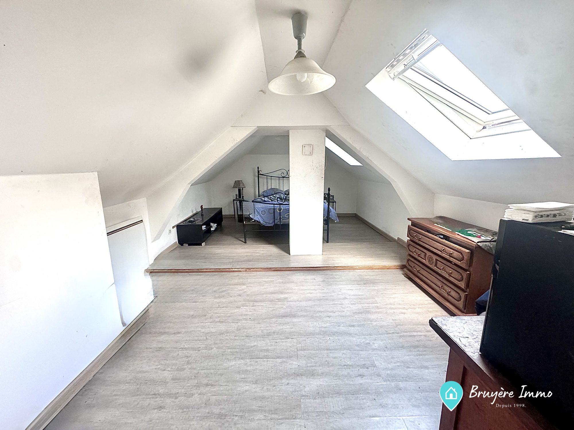 Vivre tout de suite : L'étage est déjà rénové (2 chambres, coin cuisine, douche). Créer votre espace : 158 m² de surface totale. Le rez-de-chaussée offre un volume immense pour un salon ou un second logement. Le 'Plus' rare : Une cour extérieure et un garage fermé.