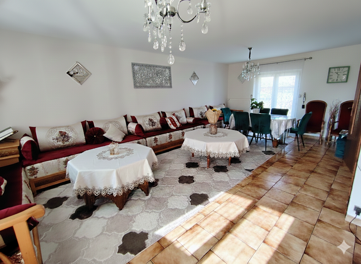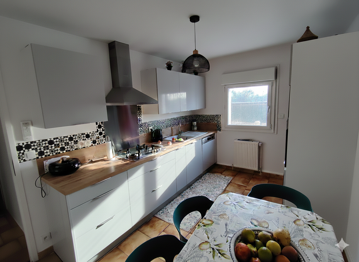 Le niveau de vie : Une entrée accueillante mène à une cuisine aménagée et un vaste salon-séjour baigné de lumière, coeur battant de la maison.