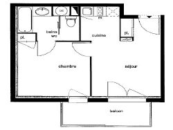 Appartement T2 de 34 m² comprenant une cuisine aménagée et semi équipée (plaque de cuisson, hotte) ouverte sur le séjour, 1 chambre avec placard, salle de bains - WC.