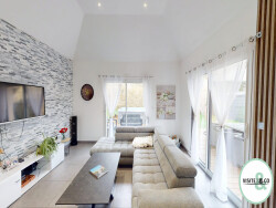 Une pièce de vie d'environ 50 m², très lumineuse de part ses baies vitrées (triple exposition : Est, Sud et Ouest). elle comprend une cuisine aménagée et équipée, une salle à manger, un salon doté de son poêle à bois, et une hauteur sous plafond qui sort de l'ordinaire donnant à la maison un certain caractère.