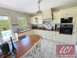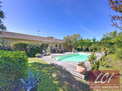 A la Teste, à moins d'1 Km des commerces et écoles, cette spacieuse maison de plain pied offre un agencement fonctionnel idéal pour une famille, et de beaux espaces avec nombreux rangements. L'entrée avec grand placard dessert un superbe séjour traversant (Est/Ouest) convivial avec cheminée et une grande cuisine indépendante aménagée avec cellier attenant. D'une part, deux chambres, une salle de bains avec wc et une salle d'eau avec wc, et d'autre part trois chambres, une salle d'eau avec wc. Les pièces de vie s'ouvrent sur le jardin verdoyant sans vis-à-vis avec sa terrasse et sa piscine. Honoraires inclus à charge acquéreur 4%. Classe énergie : C. Agence L.C.I. La Côte Immobilière, Tél 0661108516.