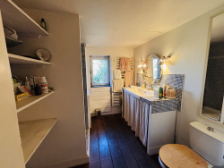 Grande pièce de 50 m2 très lumineuse, avec poêle à pellets, point d'eau et WC indépendant Nombreux rangements À l'étage : une pièce aménagée en chambre avec salle de bains