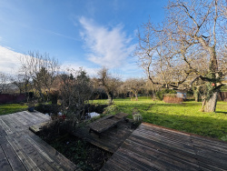 Cuisine aménagée avec tommettes anciennes, ouverte sur un espace salle à manger convivial, donnant directement sur une grande terrasse en bois et le jardin. Vaste salon baigné de lumière, sublimé par une cheminée avec insert et répartition de chaleur, créant une ambiance très cosy. Dégagement avec rangement et salle d'eau avec WC