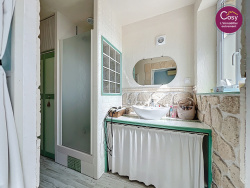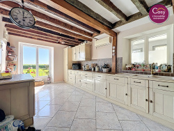 La cuisine aménagée et équipée, avec son charme authentique et ses ouvertures sur le jardin, est un véritable lieu de vie. Elle est prolongée par une arrière-cuisine très fonctionnelle, idéale pour une organisation fluide au quotidien.