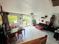 Un salon-séjour lumineux avec accès direct à la terrasse et au jardin arrière, sans vis-à-vis