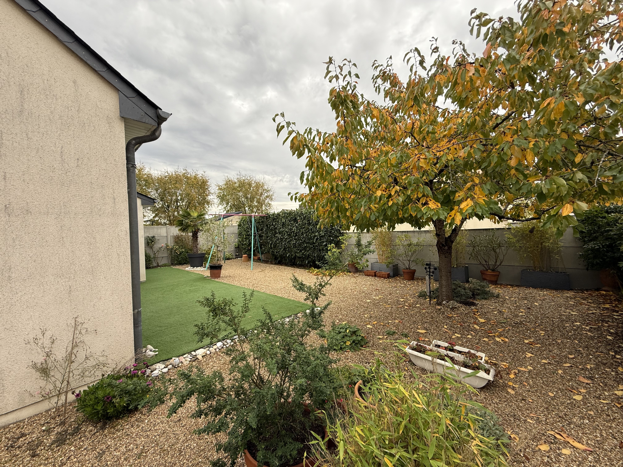 Terrain de 1 170 m², plat et arboré, parfait pour les jeux d'enfants, le jardin ou la détente.
