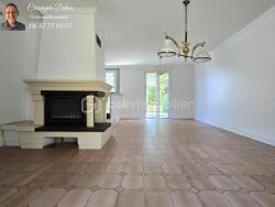 ? Un salon-séjour lumineux avec cheminée à foyer fermé, ouvert sur une cuisine aménagée et équipée,