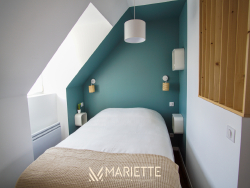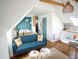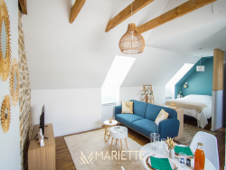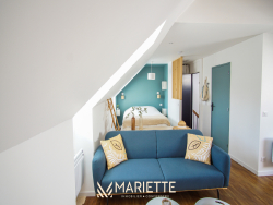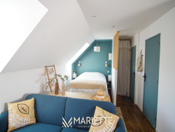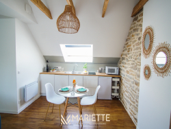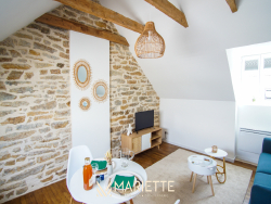 Ce studio tout confort avec son mur et ses poutres apparentes, vous permettra de passer un moment privilégié à deux ! Situé au deuxième étage dans un joli immeuble au quartier du passage, ce studio fait partie d'un ensemble de trois petits appartements bien décorés, tous disponibles à la location saisonnière. L'espace de vie agréablement agencé, vous permet d'avoir un coin cuisine-salle à manger (avec une cafetière Nespresso et une à filtres), et un coin salon pour vous détendre. La chambre à coucher se situe dans le salon, pour un moment cocooning, où vous pourrez regarder la télévision, confortablement installé dans votre lit. La salle de bain quant à elle, toute rénovée, est composée d'une baignoire où vous pourrez également vous doucher, et passer des moments de détente. Vous trouverez les W.C dans ce même espace. Idéal pour un couple, Picco Bianco saura vous faire passer un agréable séjour à deux, mais si vous souhaitez venir avec des couples d'amis tout en gardant votre intimité, deux autres appartements sont disponibles dans le même immeuble (Picco Rosso et Picco Verde, que vous retrouverez sur notre site internet). Situé dans le quartier pittoresque du « passage-Lanriec », avec ses balades le long du rivage de Concarneau, familial et calme, et avec un accès direct à la ville close par la mer avec le bac. Ce quartier face aux remparts de la ville close, anciennement en perpétuel évolution, a vu passer des ouvriers, des pêcheurs et des marchés, donnant un charme certain et une empreinte chargée d'histoire à ce lieu. Location de linge de maison : Notre conciergerie vous propose la location de linge de maison le temps de votre séjour : Kit de draps + serviettes de bain : 20 euros par lit. Taille des literies : 1 lit de 140/200. Cette option est facultative, elle doit être demandée lors de votre réservation. L'équipe Mariette Conciergerie vous accompagnera avec enthousiasme et professionnalisme lors de votre séjour. Tarif à la nuitée : à partir de 55 euros* *Hors frais de ménage, et frais administratif N'hésitez pas à nous contacter pour un devis personnalisé: contact@mariette-ic.com 02.98.51.57.79