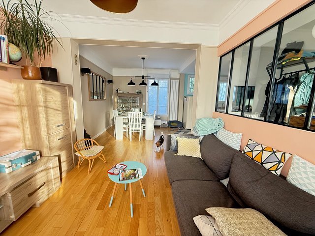 ERA IMMOBILIER MAISONS ALFORT - CHARENTONNEAU / CONDORCETSituée dans un quartier pavillonnaire, proche des écoles, des commerces (proche de la place René Coty) et à 15 minutes du Métro.Charmante maison des années 1920 rénovée avec goût, comprenant une entrée, DOUBLE SEJOUR LUMINEUX, cuisine américaine équipée, 3 chambres dont une suite parentale avec baignoire, douche et WC, un bureau, coin buanderie / chaufferie.Une cour arrière avec abris de jardin complètent ce bien.Prix : 649 000? FAI - Honoraires charge acquéreurs inclus.