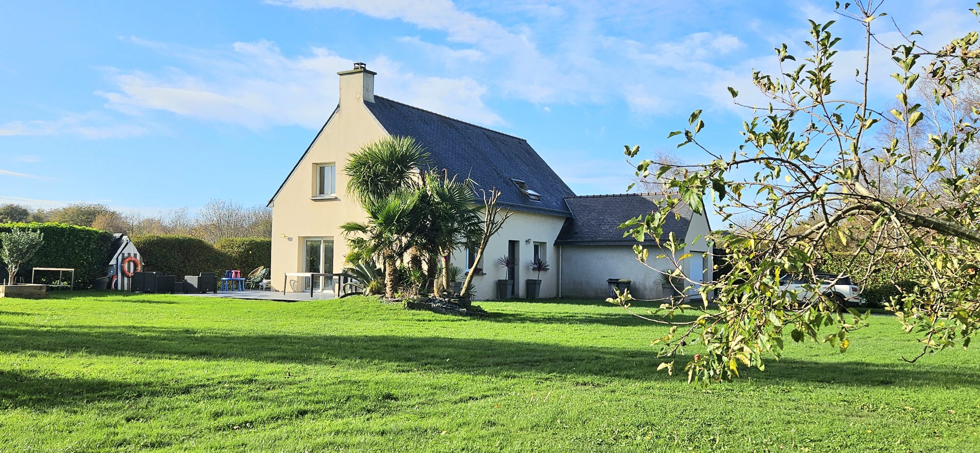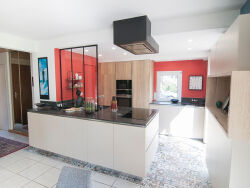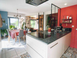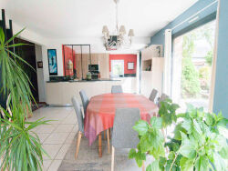 Esprit campagne et facilité de vie !Construction soignée et qualitative pour cette contemporaine lumineuse de 1993 située à 3 kms du Super U et 1,5 kms des écoles.Elle se compose d'une entrée avec placard, cuisine haut de gamme récente avec accès terrasse , salle à manger, salon avec insert, séjour, suite parentale, buanderie/cellier; à l'étage : bureau, dressing, trois chambres, sde/sdb.Son jardin joliment arboré/fleuri et intimiste est clos de mur en pierre et accueil un atelier (ancienne longère).
