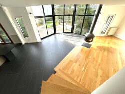 ERA IMMOBILIER L'HAY LES ROSES - VENTE - 2 MINUTES A PIED DU CENTRE VILLE - UN VRAI COUP DE COEUR pour cette belle maison d'architecte avec de très belles ouvertures, noyée dans la verdure hyper calme, édifiée sur une parcelle de 786 M² et une surface habitable d'environ 230 m² , très lumineuse exposée plein OUEST offrant : une grande entrée, un salon/séjour d'environ 60 m² avec cheminée et ouvert sur une cuisine donnant sur terrasse et son jardin clos et arboré, un espace cosy en mezzanine pouvant accueillir une bibliothèque, 7 chambres dont une avec salle de bains et dressing , 3 salles de bains et toilettes, nombreux rangements. Le sous-sol total d'environ 120 m2 comprend une buanderie/chaufferie, un grand garage 2 voitures, une cave à vin et de nombreux espaces de stockage et un accès au jardin. Deux emplacements de parkings extérieur.