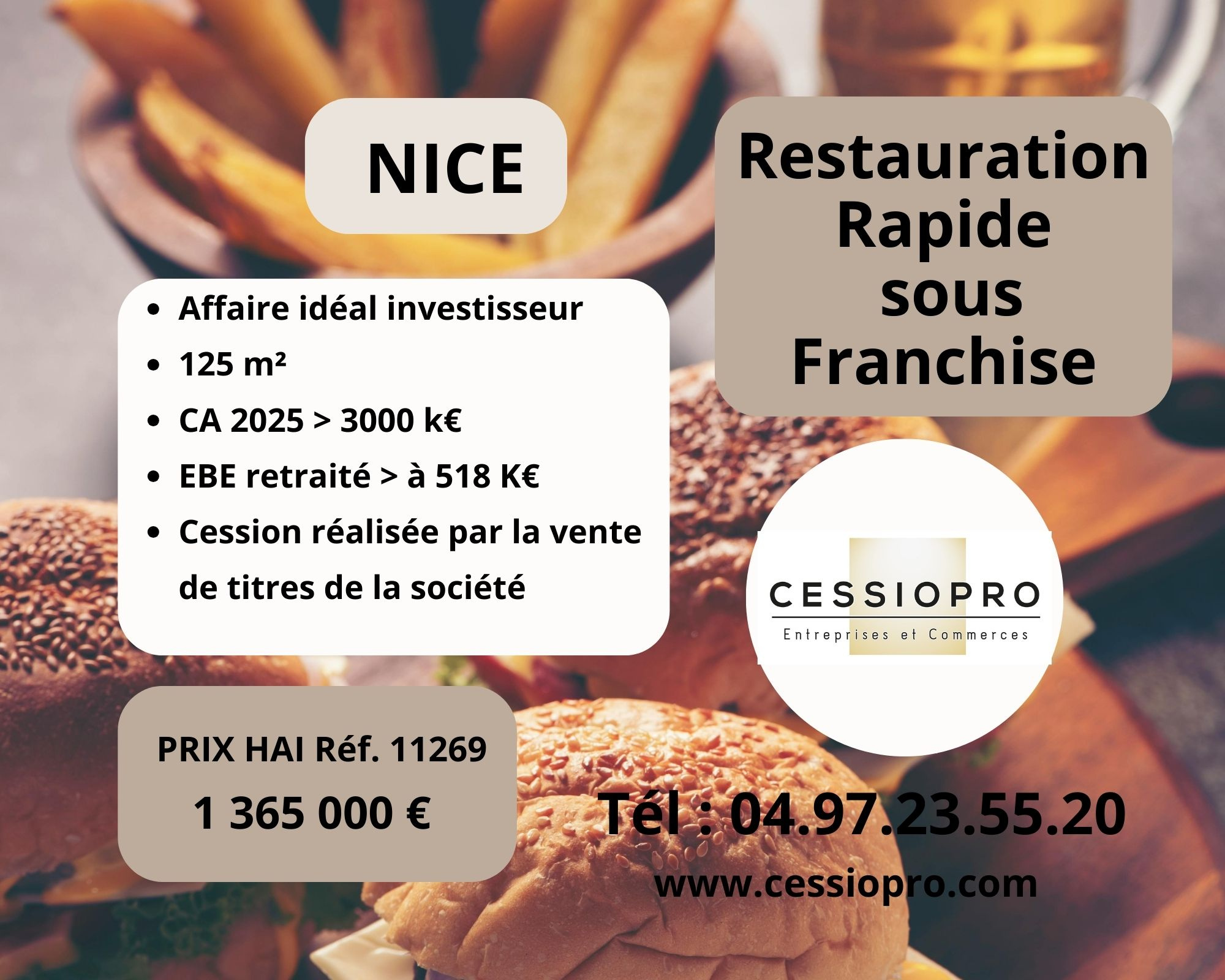 CAGNES SUR MER - Affaire de restauration rapide premium sous franchise sur un emplacement stratégique du centre commercial Shopping promenade. Dans ce centre commercial dynamique à fort flux je vous propose cette affaire clé en main , parfaitement équipée , équipe en place . . CA 2025 : 1 700 000 EUR . EBE retraité : 321 000 EUR . loyer HT/HC : 11595 EUR / mois ( part variable incluse) Les atouts : une surface de 200 m2 avec en plus une belle terrasse ensoleillé de 60 places . Un concept rentable et éprouvé sous franchise reconnue . Dossier confidentiel sur demande . Prix 1 365 000 EUR honoraires inclus honoraires de 5 % TTC soit 4,17 HT à la charge de l'acquéreur .
