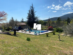 07140 les vans / exclusivité . VILLA DE STANDING 5 min. du centre des Vans, magnifique terrain paysagé, belle vue sur le serre de Barre, confortable villa de plain-pied offrant une belle pièce à vivre avec cuisine, 3 chambres, 2 salles d'eau et un cellier. Grande Piscine 'honoraires agence à la charge du vendeur'