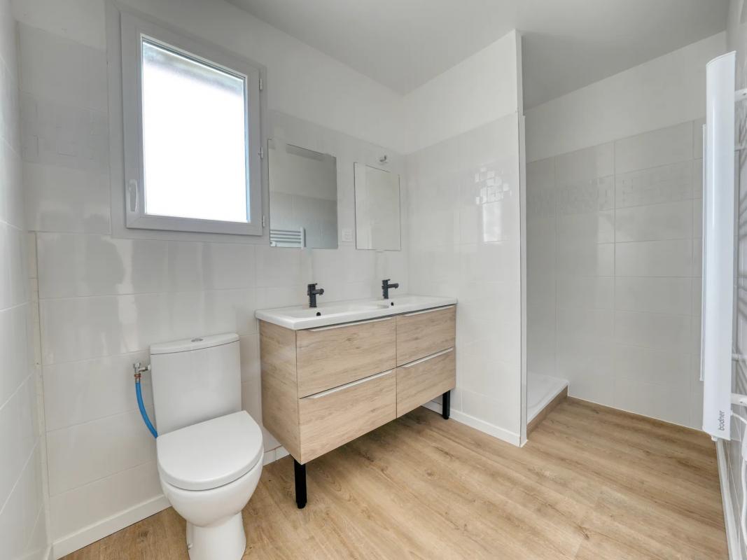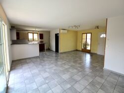 Porche d'entrée donnant sur une pièce de vie de 50 m² très lumineuse avec grande baie sur terrasse, vue sur la campagne, belle cuisine entièrement équipée, 4 chambres dont une avec sa terrasse couverte privative, SDB avec baignoire et douche italienne, WC indépendant. Garage de 15 m².