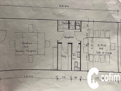 Local commercial sur rue passante : 23 m² Dégagement, stockage, sanitaires : 9 m² Bureau : 15 m² Local sur cour avec sanitaires : 57 m²
