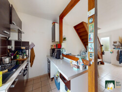 Description du bien : 4 pièces : Au RDC : - Un séjour-salon donnant sur la cuisine aménagée et équipée - Un WC avec lave-mains - Un placard intégré - Une buanderie Au 1er étage : - Une chambre accessible depuis la buanderie - Une pièce palière - Deux chambres - Une salle de bains