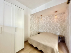 L'appartement s'ouvre sur un hall d'entrée équipé d'un placard de rangement intégré. Une pièce de vie qui comprend un séjour et une cuisine ouverte, entièrement équipée. Une chambre, accessible depuis le séjour, disposant d'une fenêtre intérieure fixe laissant passer la lumière naturelle depuis la pièce principale. Une salle d'eau moderne et spacieuse, équipée d'une douche à l'italienne et d'un meuble vasque. WC séparés avec lave-mains.