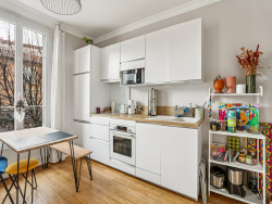 La cuisine, aux lignes élégantes et contemporaines, propose des équipements de qualité : combiné réfrigérateur encastré, four, micro-ondes, hotte, plaque de cuisson, lave-vaisselle et nombreux rangements optimisés.