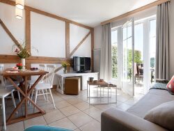 A Houlgate, avec terrasse vue sur mer, piscine extérieure chauffée et accès SPA. Les cottages sont harmonieusement disposés dans un environnement fleuri et calme.