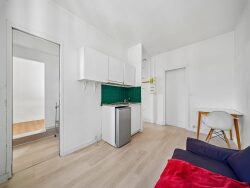 MARX DORMOY - Rue Calme Au 5? étage d'un immeuble calme sans ascenseur, ce 2 pièces de 29 m² comprend une entrée menant aux pièces principales ainsi qu'à la salle de bain avec WC, . Côté gauche : Un salon avec coin cuisine (kitchenette + frigo bas), exposé est, donnant sur la cour. Côté droit : Une grande chambre, de taille proche du salon, avec deux fenêtres en double vitrage. Le chauffage est individuel électrique. Exposition sud- est. Vue dégagée.