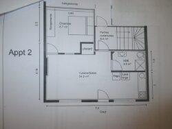 Appartement de type T1 avec terrasse et jardinet, situé au 1er étage d'un immeuble de 6 appartements sur 3 niveaux. Composé d': -1 pièce principale avec coin cuisine aménagée et équipée d'une plaque de cuisson. -1 chambre -1 salle d'eau avec WC
