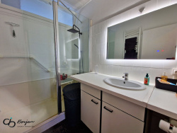 - une salle de bain comprenant douche et meuble-vasque,