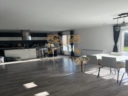 Un grand séjour avec son poêle à bois ouvert sur une cuisine équipée avec un îlot central 55 m2 1 chambre parquetée de 13 m2 et 1 salle bains équipée double vasque baignoire et douche AU RDC .