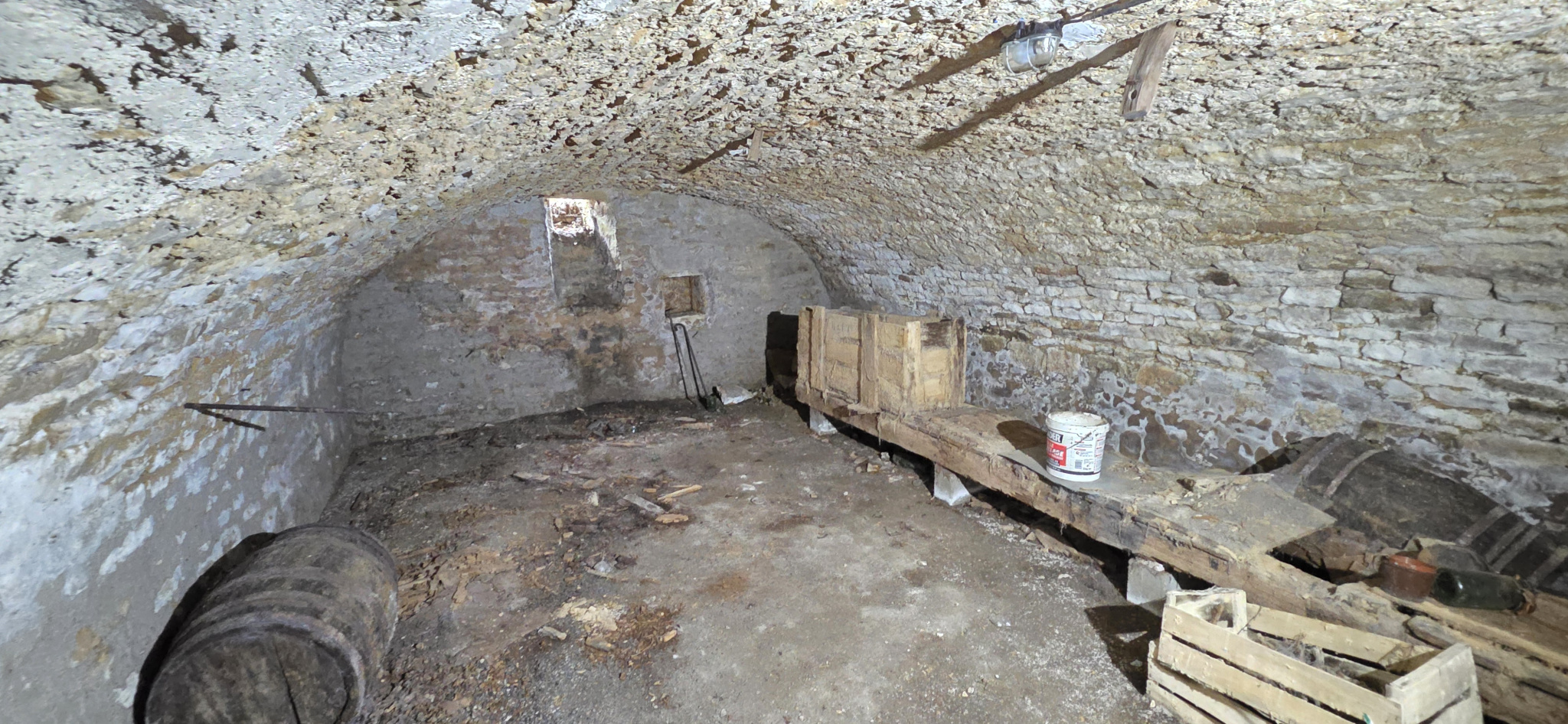 Au RDC : une grande pièce (env 67m2) avec deux cheminées - évier en pierre avec l'arrivée de l'eau courante (compteur sur place) - également un ancien compteur électrique prévoir de le raccorder ; Une ancienne grange (env 25m2) et une ancienne étable (env 22m2). Toiture refaite intégralement.- Belle et grande cave voûtée typique avec un puits. Projet (Plans) d'aménagement à disposition lors de la visite (non transmis par rmail). Du potentiel à s'approprier. - DPE GES NON REQUIS