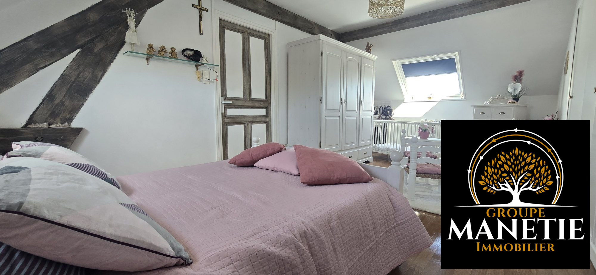 À l'étage : - Deux grandes chambres de 23 m² et 16 m² avec parquet ancien - Salle de bains avec baignoire, douche, vasque et WC