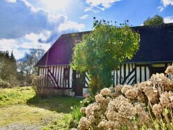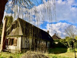 RAVISSANTE LONGERE NORMANDE: SEJOUR-SALON avec CHEMINEE, 4 CHAMBRES, SALLE de DOUCHES. BEAU TERRAIN PLAT avec REMISE. PREVOIR DES TRAVAUX.