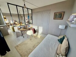 L'agencement intérieur a été pensé pour offrir un confort de vie optimal. La pièce de vie principale bénéficie d'une belle luminosité tout au long de la journée et communique avec un bureau fonctionnel, créant une perspective agréable et une polyvalence d'usage selon vos besoins. La cuisine, aménagée et équipée, dispose d'un four encastré, de plaques à induction, d'une hotte et d'un lave-vaisselle intégré.