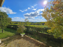 C'est en Lot et Garonne , à moins de 5 mn de toutes commodités, que se trouve cette délicieuse maison bien située en hauteur avec une vue SUPERBE! Cette maison de 1970, dispose d'environ 170m2 habitables et offre une vie sur un seul niveau et un espace supplémentaire à l'étage. En rez de jardin se compose ainsi : une véranda (21 m2) donnant sur une vue superbe (avec lumière des soleils couchants, Ouest ), une cuisine semi ouverte, lumineuse et équipée, un salon avec cheminée équipée d'un insert, un large dégagement, deux chambres ( avec parquet massif et rangements), une salle d'eau, des WC indépendants, une buanderie et un vaste garage attenant et communiquant de 44 m2, avec PORTE MOTORISÉE ( pouvant accueillir 2 voitures + espace chaufferie ). Le point fort de ce niveau est la véranda qui est chauffée et court sur toute la façade de la maison et bénéficie d'ouvertures nombreuses et d'accès direct vers la cuisine, le salon ainsi que vers les deux côtés du jardin. . L'étage propose une pièce palière avec rangements, permettant un espace jeu ou TV (ainsi qu'un accès sous combles), de deux superbes chambres de 20m2 avec nombreux rangements et disposant chacune de doubles portes vitrées et de son propre balcon ainsi que d'une salle d'eau avec WC. la maison est construite sur vide sanitaire, dispose d'une petite cave et d'un rangement pour le bois de chauffage. La propriété d'environ 3000m2, est accessible par une belle allée , est très arborée, bien fleurie. Elle est partiellement clôturée et propose les essences suivantes : figuier, pommiers, pêcher, grenadiers, palmier, mimosa, vignes, poirier, cerisiers et reine claude .