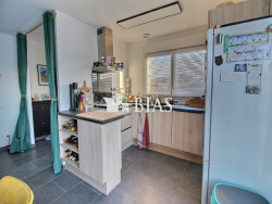 Il offre : entrée, cuisine aménagée et équipée ouverte sur la pièce de vie, salle de bains avec wc, buanderie / cellier, 2 grandes chambres et un garage attenant.