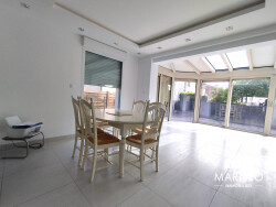 Le séjour de 66 m², baigné de lumière grâce à de larges baies vitrées et sa véranda Rénoval, s'ouvre sur un extérieur bien exposé et sans entretien. La cuisine ouverte, intégrée dans l'espace de vie, favorise une ambiance conviviale au quotidien. La maison dispose de trois chambres dont une au rez-de-chaussée, d'une salle de douche moderne et de deux WC indépendants. Le chauffage au sol par pompe à chaleur, les menuiseries aluminium double vitrage, les volets roulants électriques et l'assainissement conforme offrent un excellent confort thermique au quotidien. L'ensemble du rez-de-chaussée est accessible aux personnes à mobilité réduite. Elle dispose d'un garage. Située à seulement cinq minutes à pied du centre-ville et de la gare, vous bénéficiez de la proximité immédiate des commerces, écoles, professionnels de santé, transports et espaces verts.