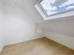 À l'étage, l'espace nuit propose trois chambres et une salle de bains complète avec baignoire, douche, double vasque et WC.