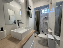 Une salle d'eau avec WC, équipée d'un lave-linge