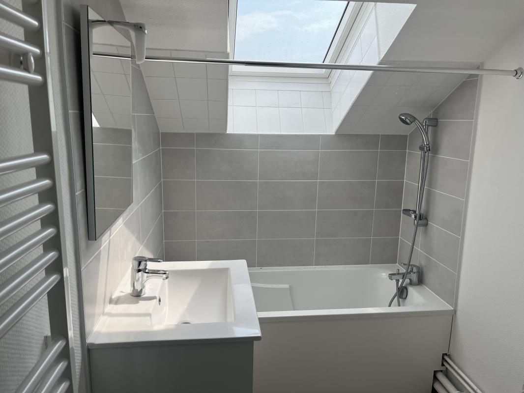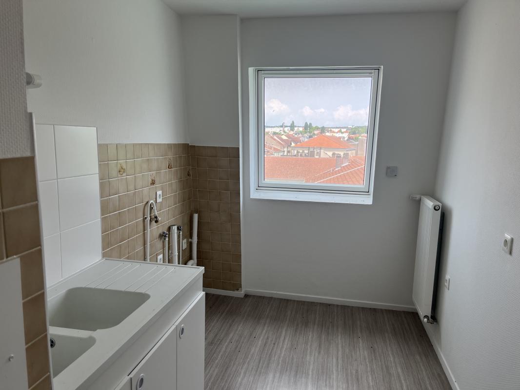 Location d'un appartement de type F4 au 3ème étage d'un bâtiment sans ascenseur. On y retrouve un grand séjour avec une cuisine fermée, 3 chambres, un WC, et une salle de bain avec baignoire. Toutes les fenêtres sont équipées de volets électriques.