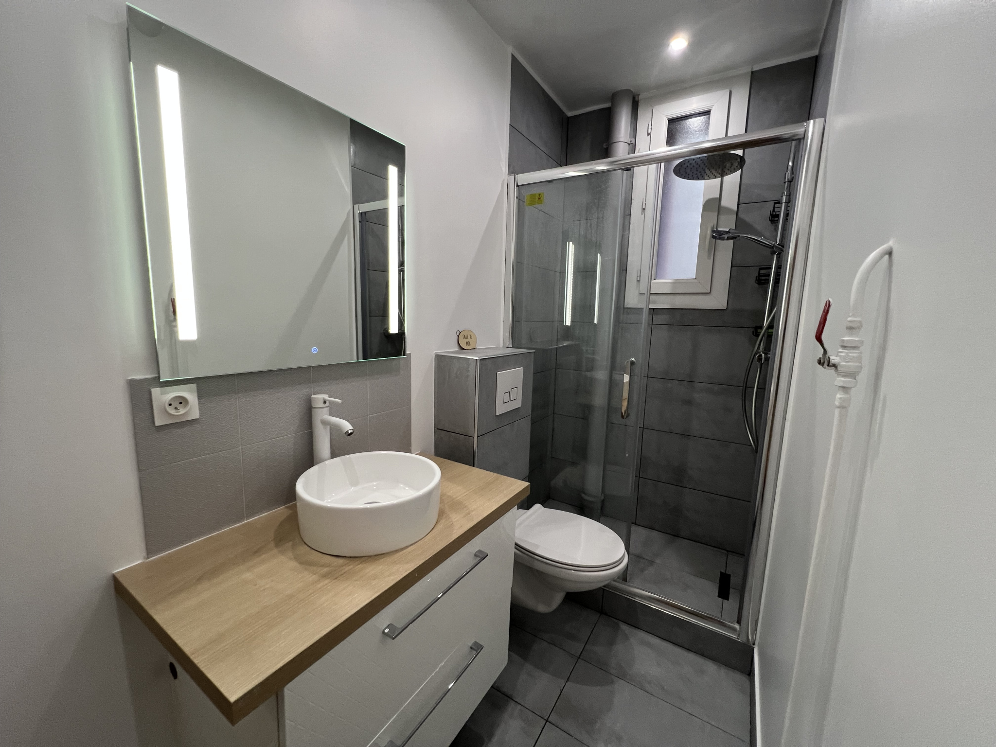 La pièce de vie, lumineuse grâce à une large baie vitrée ouvrant sur le balcon, est aménagée avec un canapé convertible et un espace repas composé d'une table haute et de chaises. La kitchenette ouverte, intégrée au séjour, est équipée de plaques de cuisson et d'un réfrigérateur. La salle de bain, spacieuse et moderne, comprend une grande douche, un WC suspendu et un meuble avec rangements.