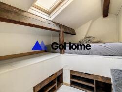L'appartement s'organise en duplex et s'ouvre sur un séjour lumineux avec poutres apparentes, accompagné d'une cuisine ouverte équipée de plaques de cuisson, d'un réfrigérateur et d'une machine à laver. Ce niveau comprend également un espace modulable pouvant servir de salon ou de chambre. À l'étage, une chambre mansardée avec espace bureau intégré, ainsi qu'une salle de bain avec baignoire et des WC indépendants.