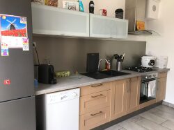 Entrée, wc, cellier, cuisine aménagée et équipée ouverte sur séjour salon. A l'étage : 3 chambres, salle d'eau avec wc. petit jardin clos, terrasse. le loyer est de 830 euros et 27 euros pour les ordures ménagères chauffage au gaz de ville, eau et edf et gaz individuelles