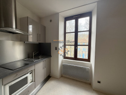A louer Saint Affrique, centre-ville, Place de la Liberté, appartement de type 2 en 3eme étage. 29 m2 habitables, séjour avec cuisine équipée ouverte (plaque électrique, hotte, frigidaire top, micro-ondes), chambre avec dressing, salle d'eau avec w-c. hubert-peyrottes-immobilier.fr 05 65 99 19 19
