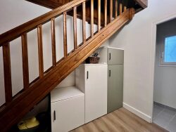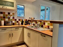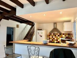 Au rez-de-chaussée : - une pièce de vie avec sa cuisine ouverte (retour bar), toute équipée (four et hotte électrique, plaques gaz bouteille, réfrigérateur/congélateur et lave vaisselle), ainsi qu'une buanderie, - une chambre avec 2 lits doubles (dont un en mezzanine), - une salle d'eau, et un wc séparés, Et à l'étage, 2 grandes chambres (dont une avec rangements).
