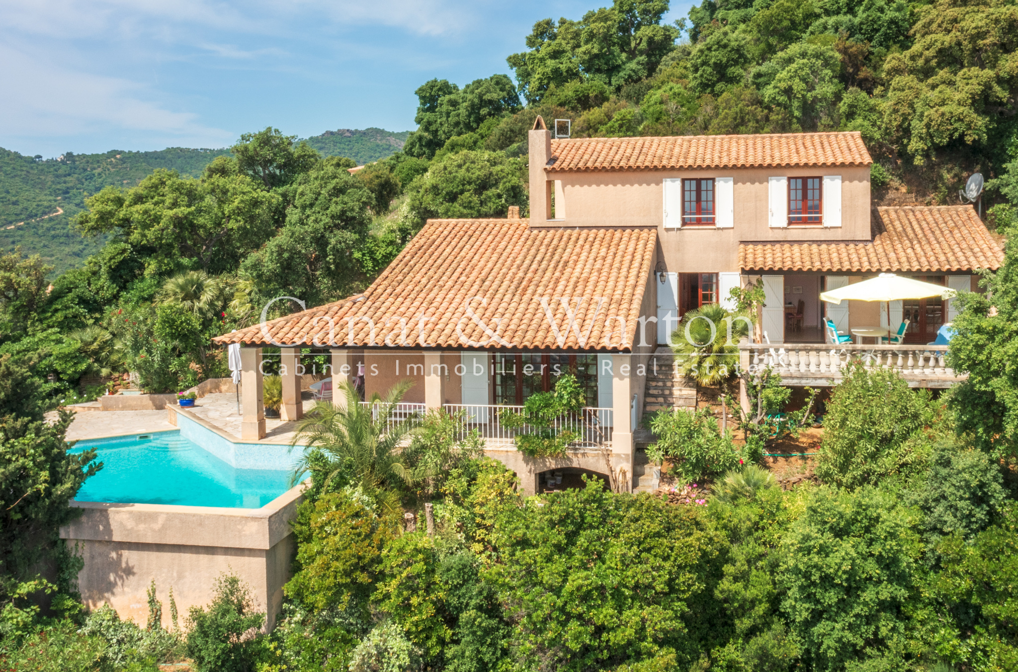 CANAT & WARTON Golfe de Saint Tropez présente une propriété exceptionnelle aux Calanques/ Le Cap Cavalaire avec vue sur la mer. Idéalement située à quelques pas des calanques, cette villa s'étend sur 184 m2 sur un terrain plat & arboré de 923 m2. Elle est composée par une entrée, un séjour/ salle à manger s'ouvrant sur une terrasse, un patio intérieur et un jardin par des baies à galandage, une cuisine équipée et une arrière-cuisine avec buanderie, 2 chambres et salle de bain. Au 1er étage, il y a une chambre avec terrasse, une salle de douche avec hammam et une vue imprenable sur les criques, ainsi qu'un bureau. La propriété dispose d'un garage pré-équipé pour être transformé en habitation, d'une cave en sous-sol avec douche & wc, ainsi que d'un vide sanitaire. Possibilité de construire une piscine. Flavien GRANDMAIRE, directeur de l'agence CANAT & WARTON Golfe de Saint Tropez est à votre disposition au 143 Rue du Port 83240 Cavalaire +336 47 52 46 42/ canatwartoncavalaire@gmail.com. WE SPEAK ENGLISH-WIR SPRECHEN DEUTSCH. Les informations sur les risques auxquels ce bien est exposé sont disponibles sur le site Géorisques www.georisques.gouv.fr