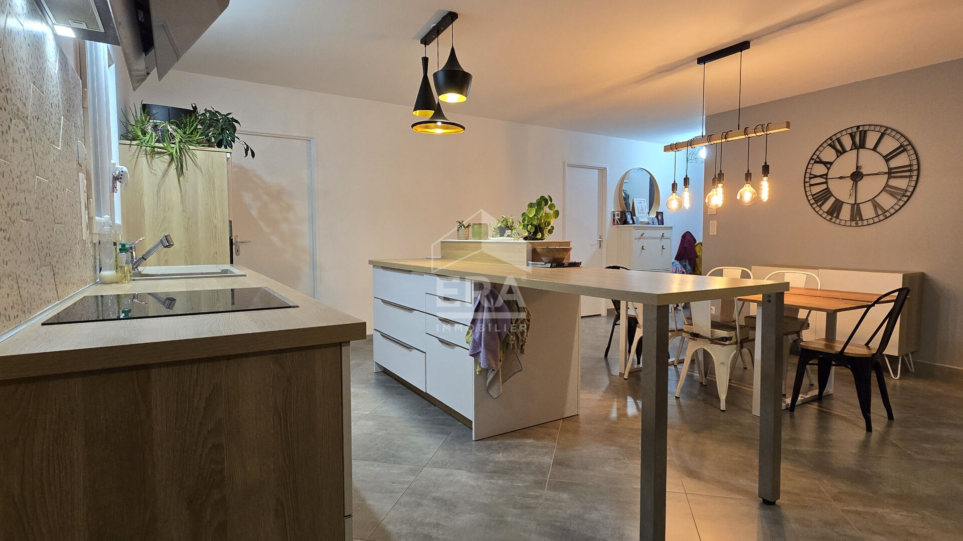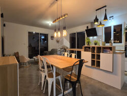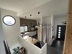 Au Fontenay maison moderne atypique de 2020 au calme , comprenant une entrée, wc , cuisine équipée , suite parentale avec salle de douche et dressing, on descend quelques marches pour y trouver une grande pièce de vie donnant sur une grande terrasse sans vis à vis , à l'étage une grande mezzanine desservant 2 chambres, wc , salle de bains, un grand garage