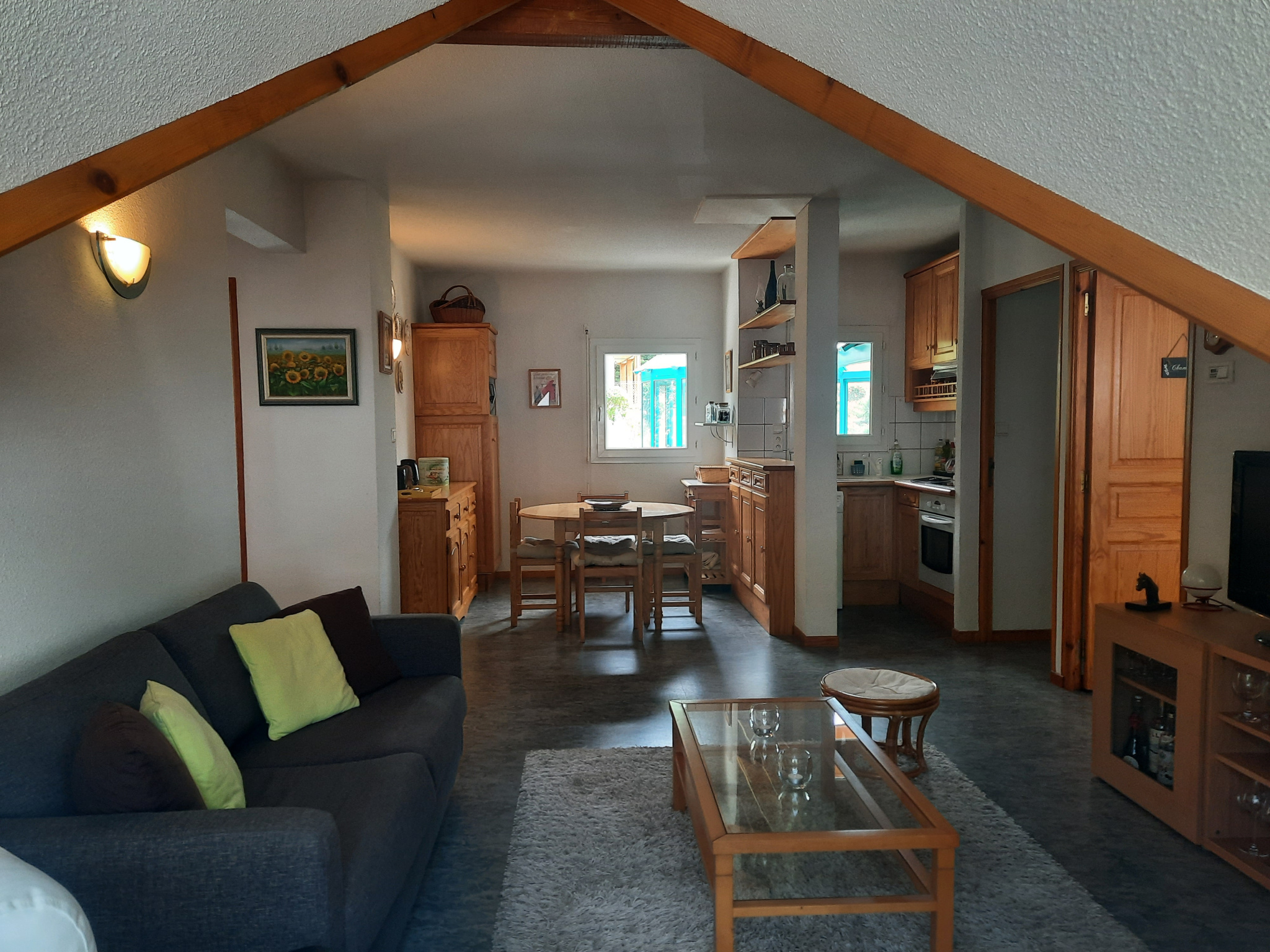 Surface : 48,52 m2 Pièces : 1 chambre + 1 coin nuit (cabine) Séjour : espace lumineux avec cuisine ouverte toute équipée (plaque vitrocéramique, hotte, réfrigérateur, four, micro-ondes, lave-vaisselle) Extérieur : balcon de 7,71 m2 avec vue dégagée Sanitaires : salle d'eau et WC séparés Rangements : cellier fermé Confort : ascenseur, place de parking privative