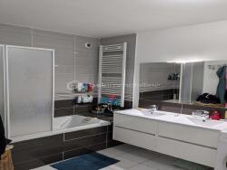 Au premier étage, la maison comprend deux chambres confortables, une salle de bains et un second toilette séparé. Le palier dessert harmonieusement les différentes pièces et donne accès à une grande terrasse d'environ 20 m², parfaite pour les repas en extérieur ou les moments de détente.