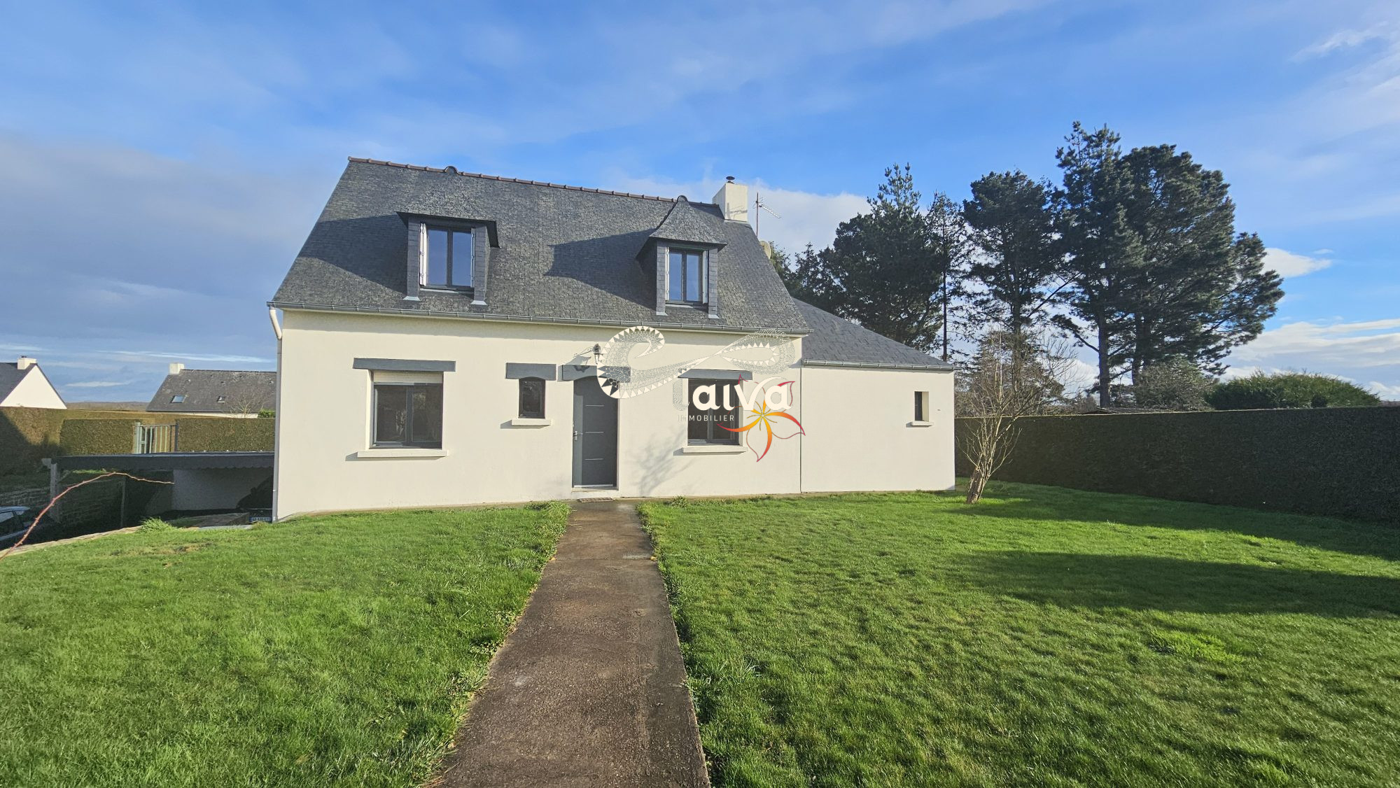 A vendre chez Christelle Mesnage Immobilier, LANVALLAY. A 5 minutes de Dinan, belle maison Néo-bretonne de 150m² habitables offrant : une entrée, un séjour avec une cheminée insert et un accès au jardin ainsi qu'à la terrasse, une cuisine équipée avec un accès au jardin et à la terrasse, un dégagement, un bureau avec placard, quatre chambres dont deux avec placard et une au rez-de-chaussée, un palier, une salle de bains avec une douche à l'italienne, une salle d'eau équipée avec une douche à l'italienne. Le tout sur un terrain arboré et clos de 740m². Proche des commerces, proche de Dinan, proximité des transports.Proximité de la Rance, Lumineuse, Bonne construction.