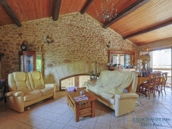 Salon donnant sur une belle terrasse et cuisine équipée et aménagée de 45m2 poêle-a-bois, trois grandes chambres ( 13,54 -11-16,89m2 ) salles d'eau / bain , wc indépendant , caves voutée en pierre. .